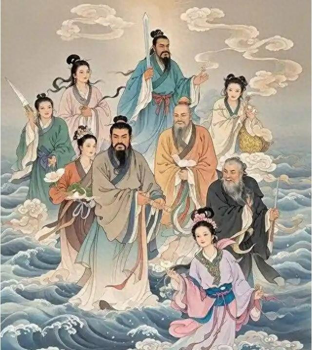其他几位神仙纷纷赞同。张果老捋着白胡子,笑眯眯地倒骑上他的小毛驴;何仙姑从袖中取出一枝粉荷,轻轻摇曳;蓝采和挎着花篮,哼着小调;韩湘子横笛在手,曹国舅捧着玉板,吕洞宾则背着他的青锋宝剑。